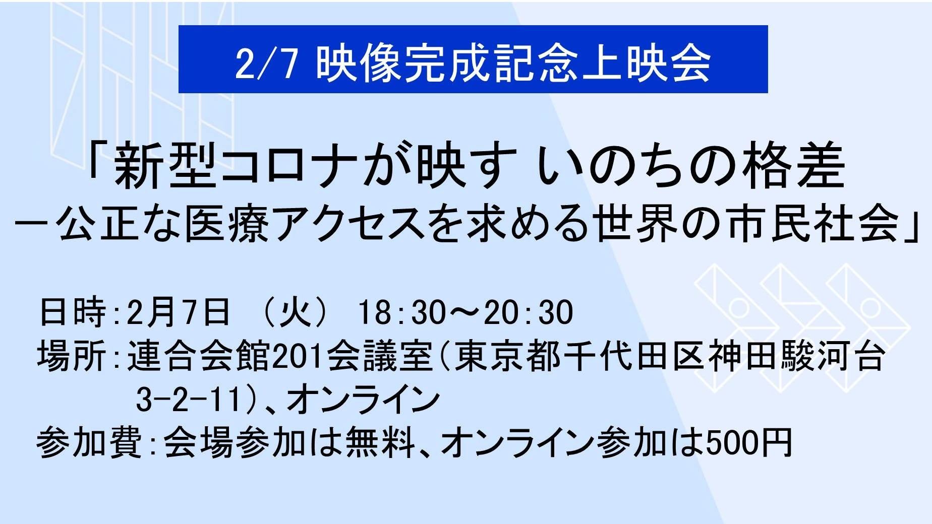 この度、事務局を務めるネットワーク「新型コロナに対する公正な医療アクセスをすべての人に!連絡会」で、社会の課題を鋭く追及する映像作品を生み出してきた特定非営利活動法人アジア太平洋資料センター(PARC)とともに、映像作品「新型コロナが映すいのちの格差—公正な医療アクセスを求める世界の市民社会」を制作しました。