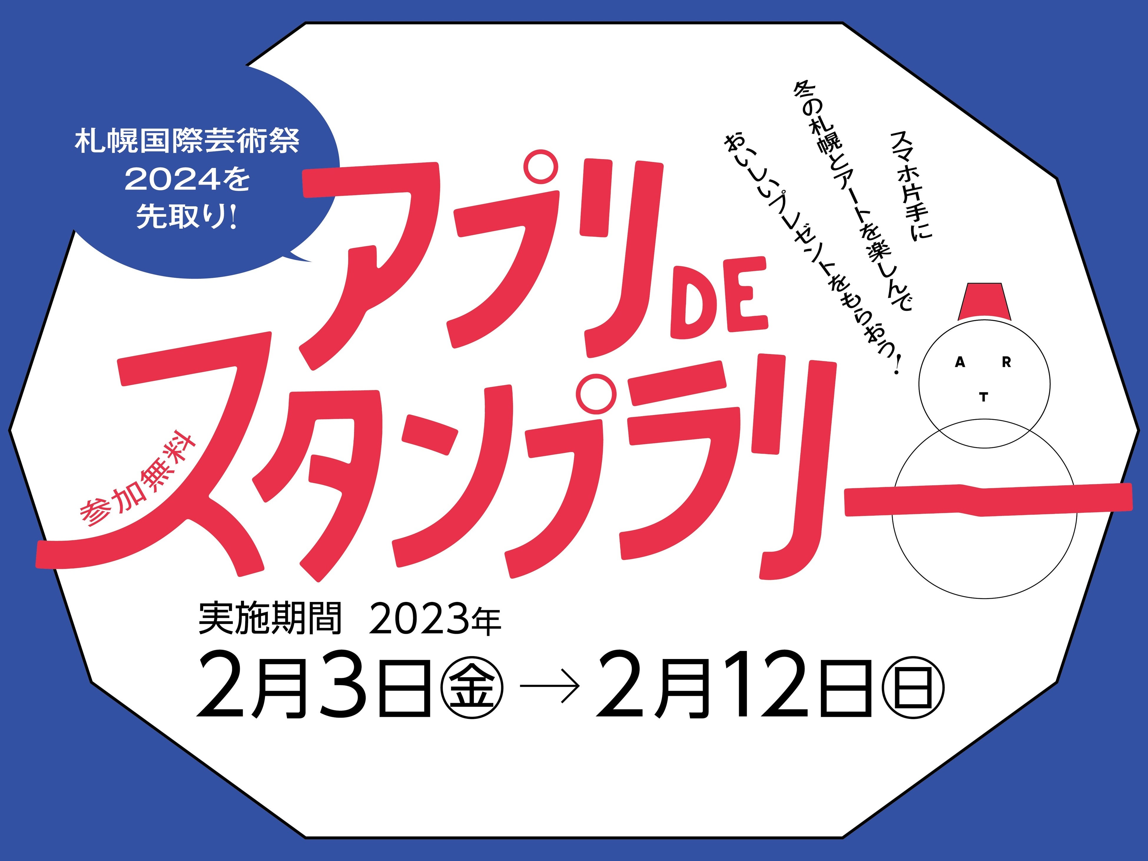 2023年2月3日より開催される「スマイルリンクさっぽろ」の会期に合わせ、イベントで賑わう冬の札幌をスタンプラリーで楽しみながら、来たる札幌国際芸術祭2024への造詣を深めてもらうことを目的に展開されます。