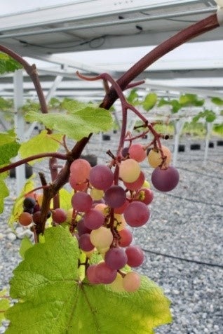 (左:ワタミオーガニックランド内のソーラーシェアリング、右:ソーラーシェアリングで栽培しているブドウ)