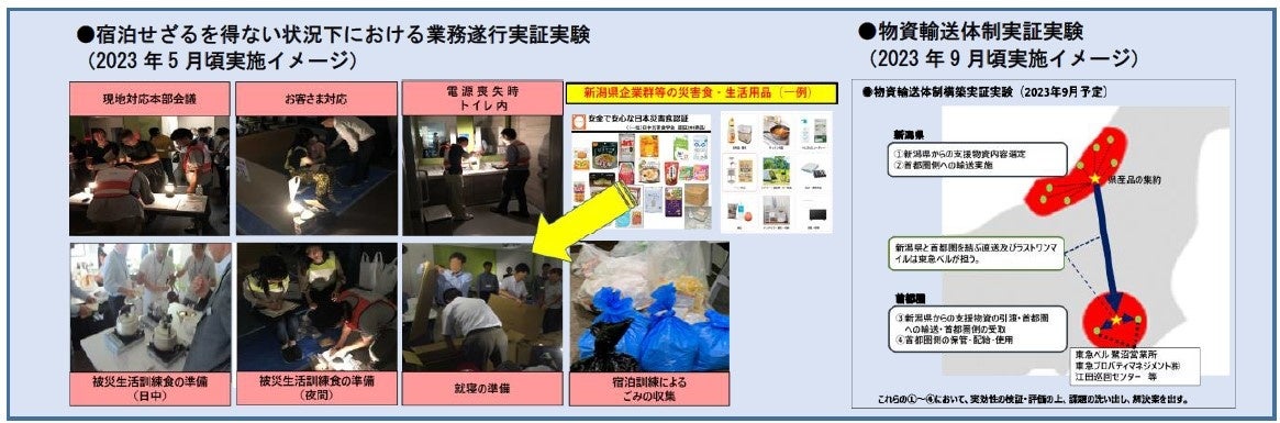 本協定締結後の連携施策の第一弾として、2023年5月頃に、新潟県において蓄積された事業継続に関するノウハウを活用し、発災から72時間の待機期間や、各種ライフラインが停止する中、宿泊せざるを得ない状況下での業務遂行について実証実験を予定しています。また、第二弾として、2023年9月頃に、新潟県と首都圏を結ぶ物資輸送体制の確立に向けた実証実験を予定しています。