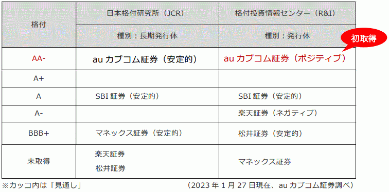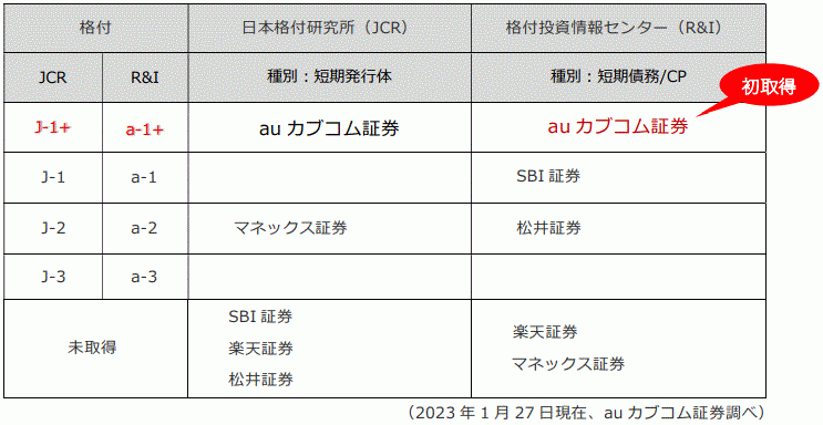 auカブコム証券株式会社(本社:東京都千代田区、代表取締役会長兼社長:二宮明雄、以下「auカブコム証券」)は、2023年1月27日、格付投資情報センター(「以下、R&I」)による発行体及び短期格付が、下表のとおりとなったことをお知らせいたします。