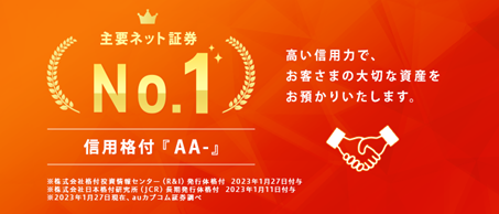 なお、長期の格付は下表のとおり、主要ネット証券会社の中で最上位を維持しています。auカブコム証券は引き続きこのような高い信用力の下、お客さまの大切な資産をお預かりしている責任を果たし、「すべてのひとに資産形成を。」のミッション実現につとめてまいります。