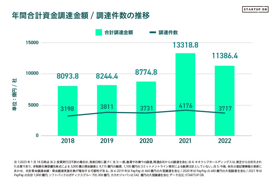 また、資金調達の実施件数は3,717件であり、2021年は4,176件だったため、前年比で459件のマイナスとなりました。