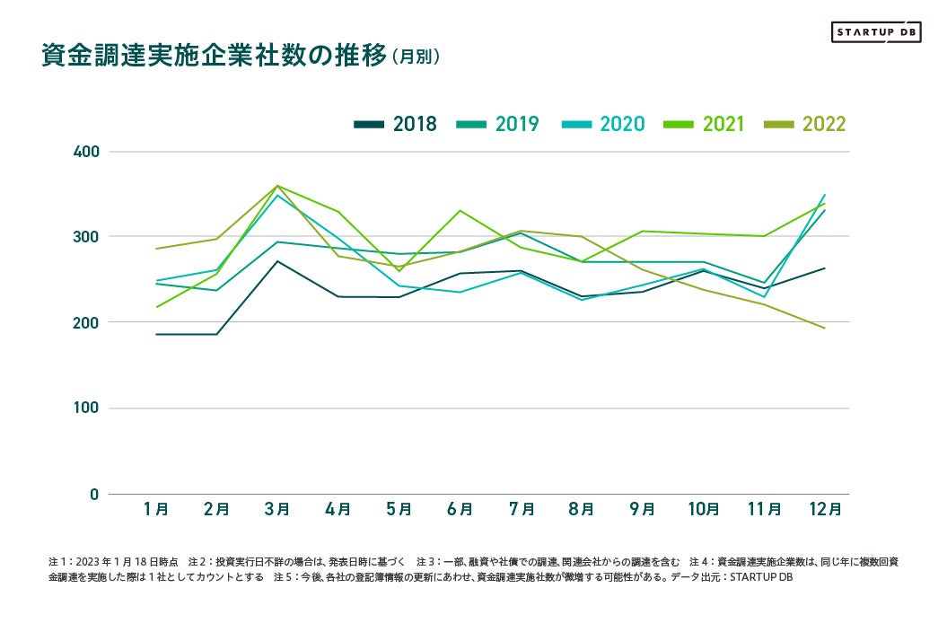 2022年4月以降は月間合計資金調達金額とあわせ、合計資金調達実施企業数も大幅に減少