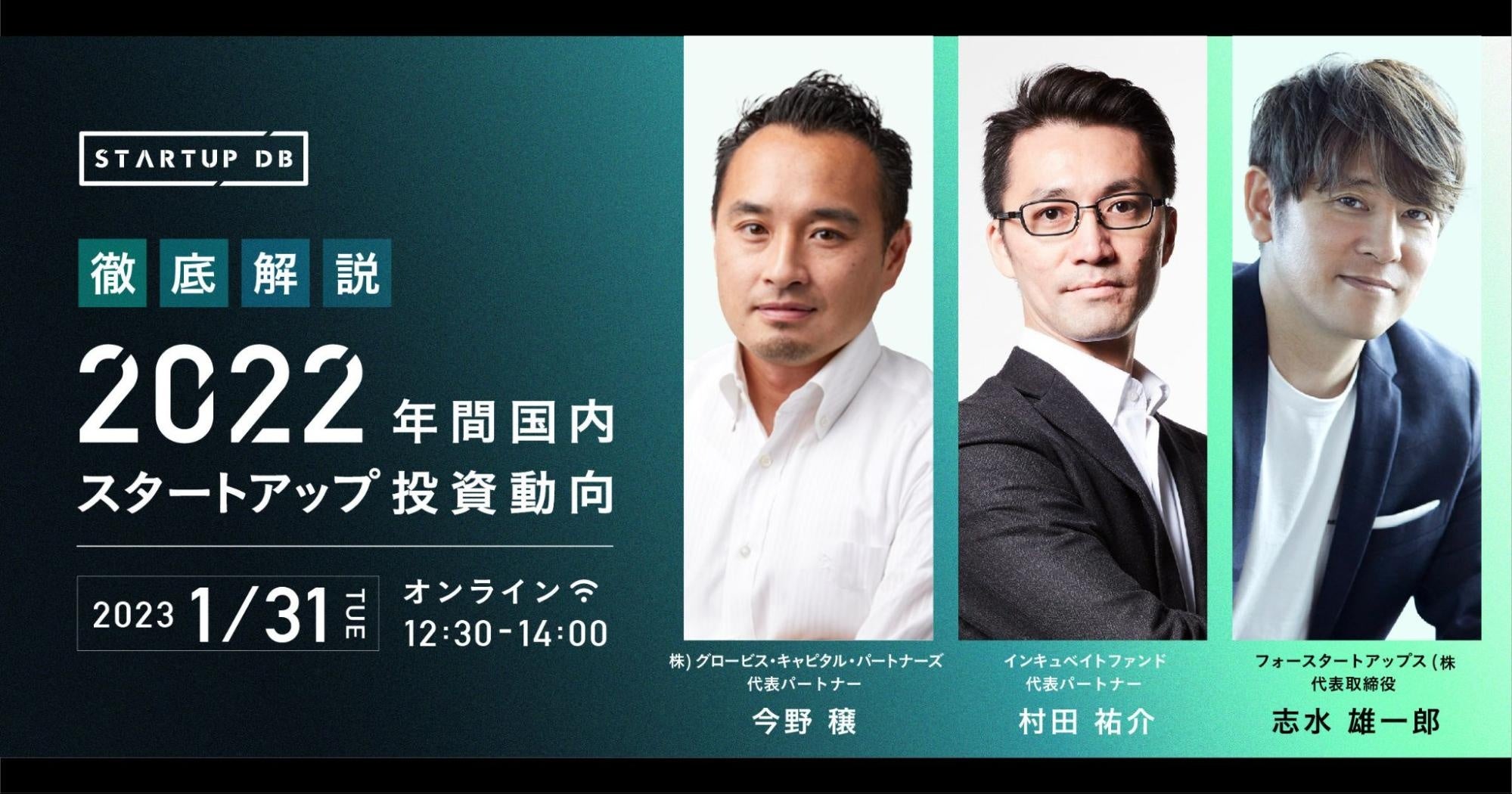 本レポートの公開に伴い、レポート内容に合わせて今後のスタートアップの動向を紐解くセミナーをオンラインで開催いたします。独自調査による最新レポートのグラフを見ながら、投資動向の傾向について、また、2023年の予想までを読み解いていきます。現在VCの最先端でご活躍されているお二方の、スタートアップ、そして日本に対する投資動向へのメッセージを最速で聞け、質疑も可能な貴重な1時間半となっております。