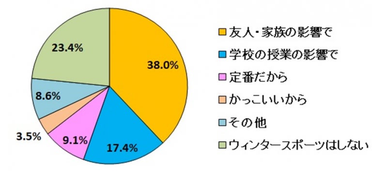 ウィンタースポーツを始めたきっかけのトップは「友人・家族の影響で」がトップで回答数の38.0%(449人)。「学校の授業の影響で」が17.4%(206人)で続いています。