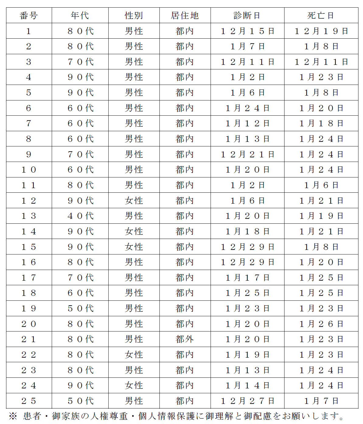 新型コロナウイルスに関連した患者の死亡について business Twitter Facebook はてブ Pocket LINE コピー 2023.01.28 この記事は約1分で読めます。 都内で新型コロナウイルスに感染した方が死亡されましたのでお知らせします。 お亡くなりになった方のご冥福をお祈り申し上げます。 1 新型コロナウイルスに関連した死亡者(本日公表分) 2 新型コロナウイルスに関連した死亡者の累計 7,585人