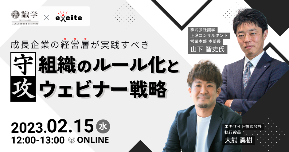 今回は識学を急成長させた第一人者である山下氏をお呼びして、成長企業が実践するべき【守】組織のルール化と、多くの新規事業立ち上げを推進してきた弊社大熊よりPMF前後の【攻】ウェビナー戦略についてお話しいたします。