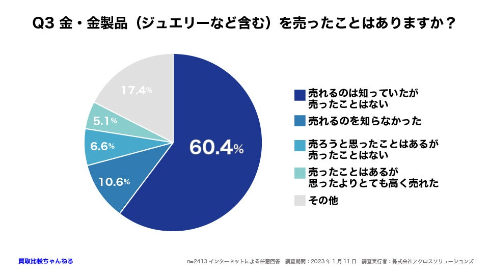金製品・金のジュエリーなどを売ったことがない人が全体の7割で、中でも「売れるのは知っていたが売ったことはない」という人が多く、60.4%でした。