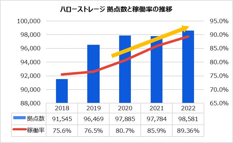 ハローストレージの拠点数に対する稼働率はコロナ禍以前の2019年は76.5%、コロナ禍以降は年々上昇しており、2022年は89.3%と高くなっています。リモートワークや外出自粛によって、家で過ごす時間が多くなったコロナ禍において、家や仕事の荷物整理のニーズが増えたことが要因の1つとして考えられます。