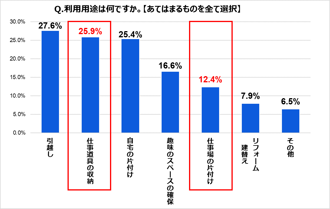 利用者に対して利用用途について聞くと、最も多かった回答は“引越し”(27.6%)、“仕事の片付け”(25.9%)、“自宅の片づけ”(25.4%)という順となりました。