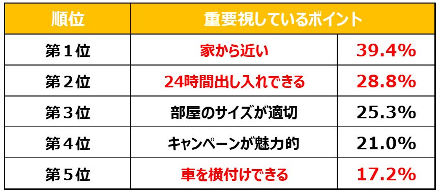 ハローストレージの利用者に対して、トランクルームを選ぶ際に重要視しているポイントを聞くと、第1位の”家から近い”(39.4%)のほかにも“24時間出し入れできる”(28.8%)、“車を横付けできる”(17.2%)など、トランクルームを実際に利用する際には、出し入れの際の利便性を求める実態が明らかになりました。