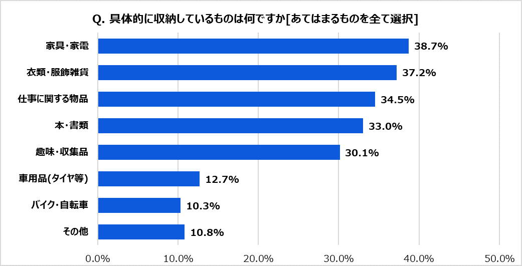 具体的に収納しているものについては、最も高かったのは“家具・家電”(38.7%)、続いて“衣服・服飾雑貨”(37.2%)、“仕事に関する物品”(34.5%)という結果となりました。引っ越しや家のスペースを空けるために家具・雑貨等を収納する用途が多い中、“仕事に関する物品”についても34.5%と比較的多い結果となりました。