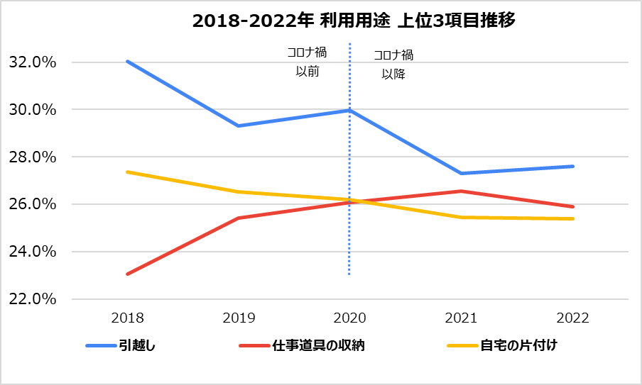 2018年から2022年の上位3項目の利用用途の推移を見ると、全ての年で引越しが最も多い結果となりました。コロナ禍以前である2018~2019年は“自宅の片付け”が2位となっていましたが、年々減少傾向にあり、コロナ禍の2020年以降からは“仕事道具の収納“が増加し2位となりました。
