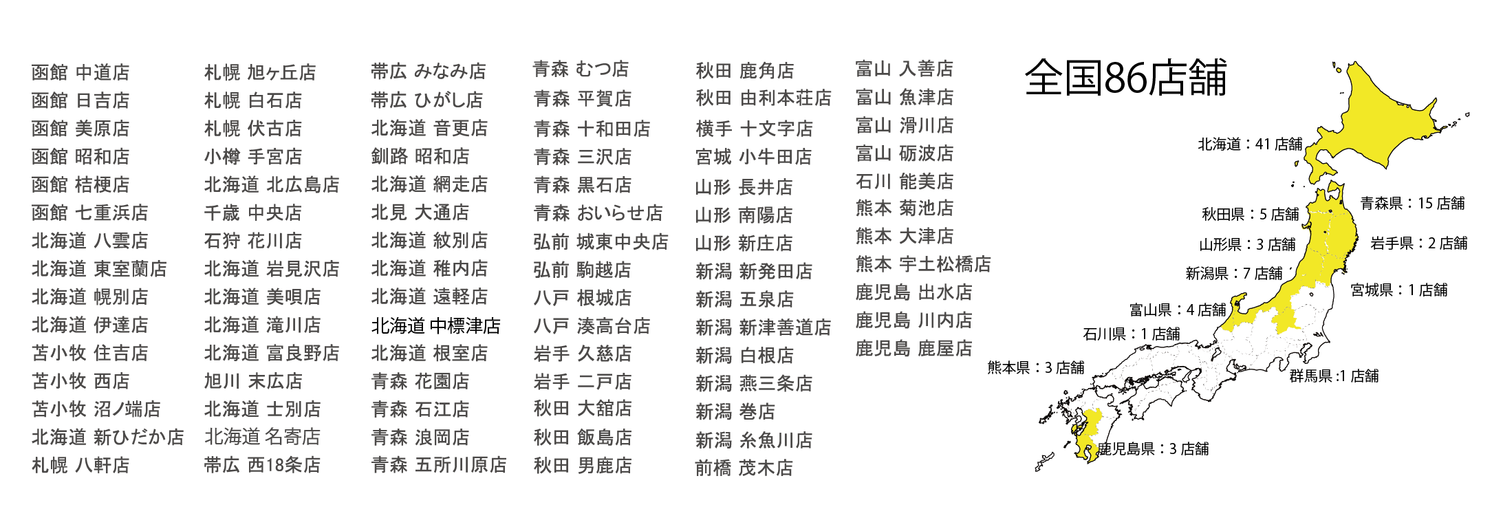 :全国86店舗中、北海道内41店舗。北海道の出店市町村数圧倒的NO.1!(自社調べ)
