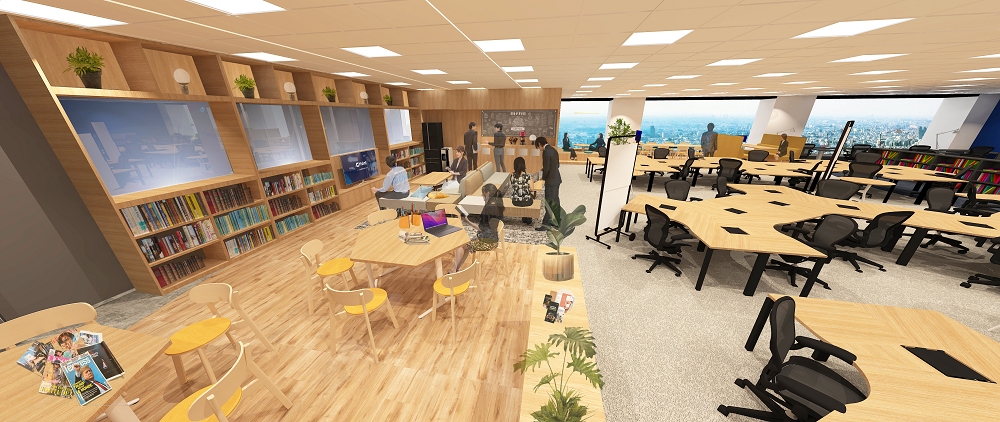 社員が活躍する執務エリアは、出社時に1人1人が業務に最適な取り組み方ができるように、多様性に富んだ構成としています。チーム単位で座りやすいアメーバ型のデスク配置、チームを超えたコラボレーションが生まれやすいオープンな会議スペース、集中して業務に取り組める落ち着きあるデスクスペース・BOX型デスクなど。また、リフレッシュスペースでは、自由にコミュニケーション・休憩ができるソファや、「気づき」や「繋がり」のきっかけとなる本棚、ドリンクコーナーを配置しました。