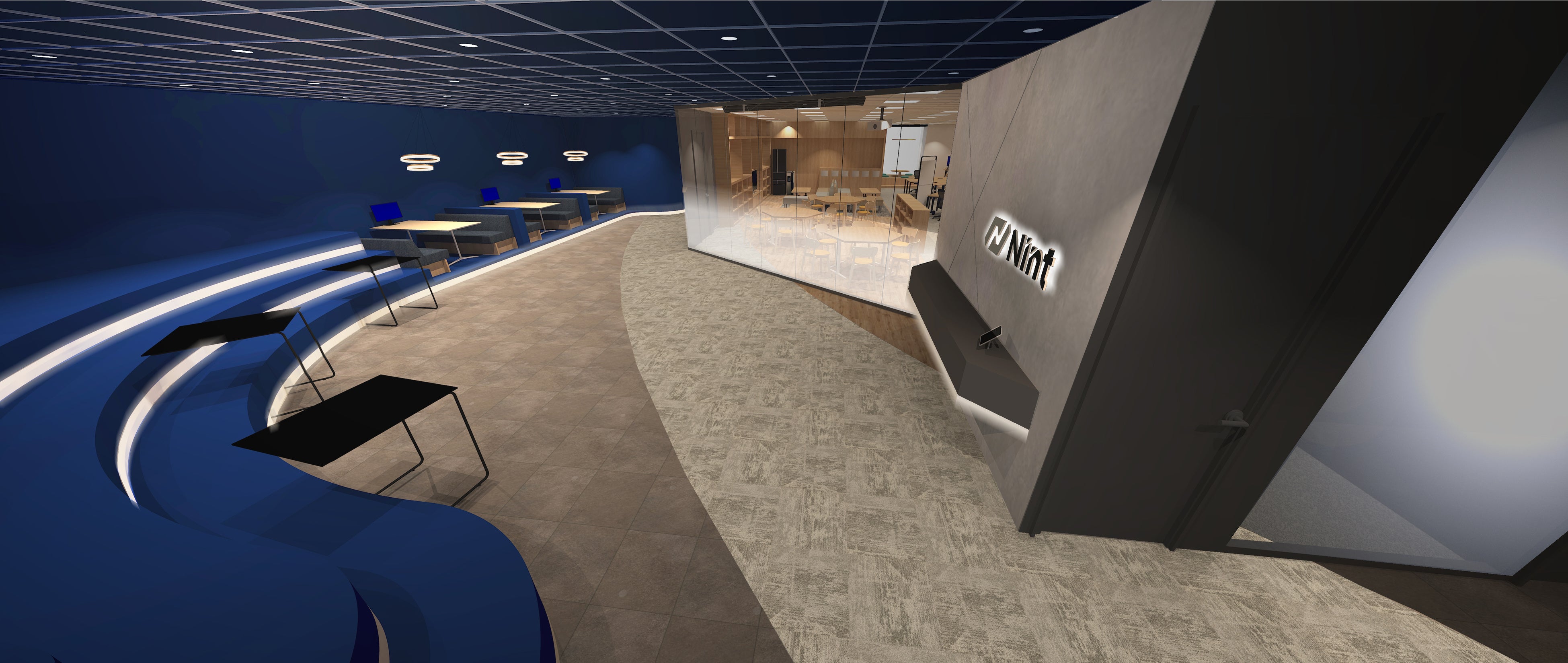 ご来社される全ての方々に、Nintを知っていただく場所となるように、オフィス内の様子を感じていただける見通しの良いエントランスとし、我々の目指す姿についても体感いただく場としました。