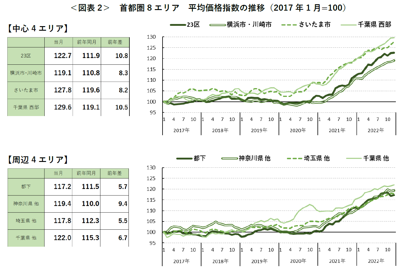 - 東京23区、横浜市・川崎市、さいたま市、千葉県(西部/他)の5エリアで2017年1月以降最高額を更新。
