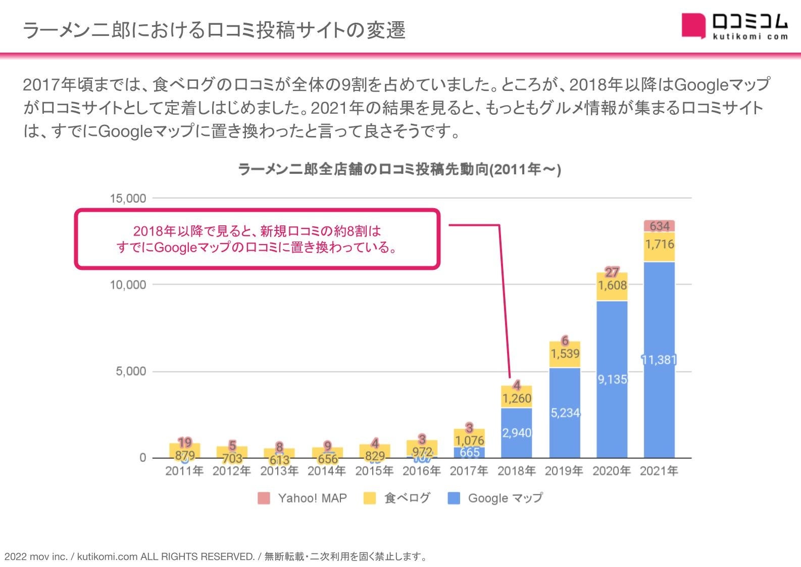 今回、Googleマップ・食べログ・Yahoo!MAPの3サイトで調査を行いましたが、2018年には食べログを抜いてGoogleマップへの投稿がメインの口コミ投稿先になりました。2018年以降もGoogleマップへの投稿は増え続け、2021年には11,000件を超える投稿がGoogleマップに寄せられています。