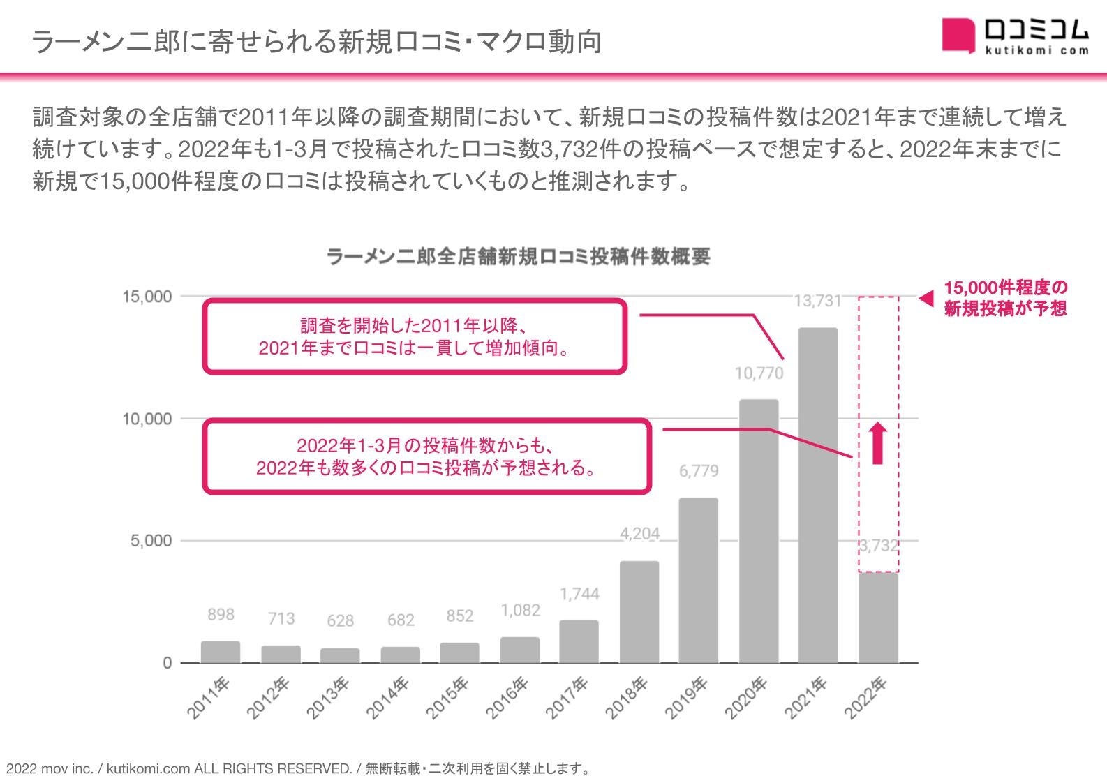 ラーメン二郎では口コミが2013年以降は一貫して増加傾向です。なお、2022年も約15,000件ほどの新規口コミが投稿される見通しです。今後口コミ対策の重要性は引き続き高まっていくものと予想されます。