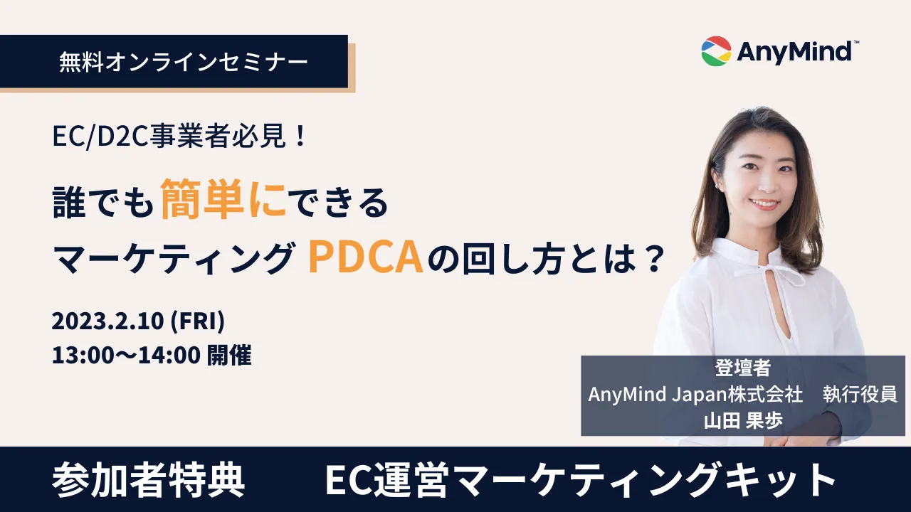 AnyMind Group株式会社(読み:エニーマインドグループ、代表取締役CEO:十河 宏輔、以下「当社」)は、2023年2月10日 (金)13:00よりEC/D2C事業者向けの無料ウェビナー「誰でも簡単にできるマーケティングPDCAの回し方とは?」を開催いたします。