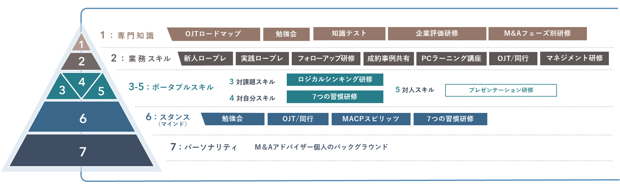 MACPでは創業から18期にわたり難易度が高い多くのM&Aを手掛け、象徴である大型案件創出の指標である株式譲渡の平均価格は約15.0億円と、他のM&A仲介業者に比べ圧倒的なM&Aアドバイザーの実績を有してまいりました。この圧倒的な実績を果たしてきた源泉がM&Aアドバイザーの「育成プログラム」です。この創業から18年かけて確立された「育成プログラム」こそが、新卒人財を育てることができる重要な証です。