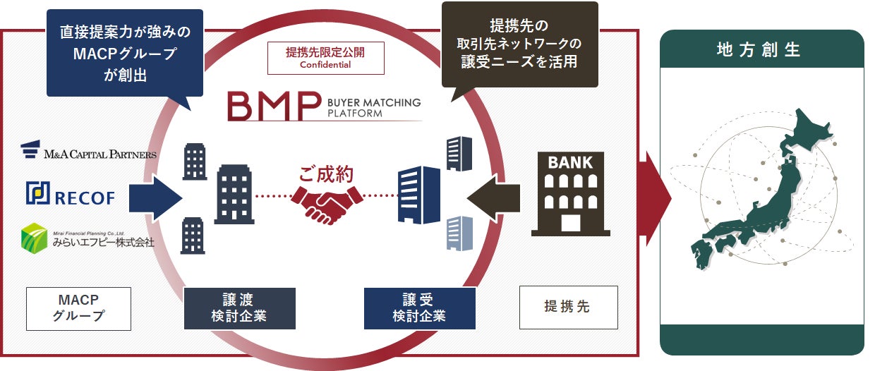 MACPグループがお預かりする譲渡検討企業(売り手企業)に最良なお相手とのマッチングを実現するために、全国各地の金融機関の提携先から譲受検討企業(買い手企業)を当社独自開発のWEBプラットフォーム上でご紹介いただくクローズドなマッチングサービスで当社提携先のみご利用可能です。