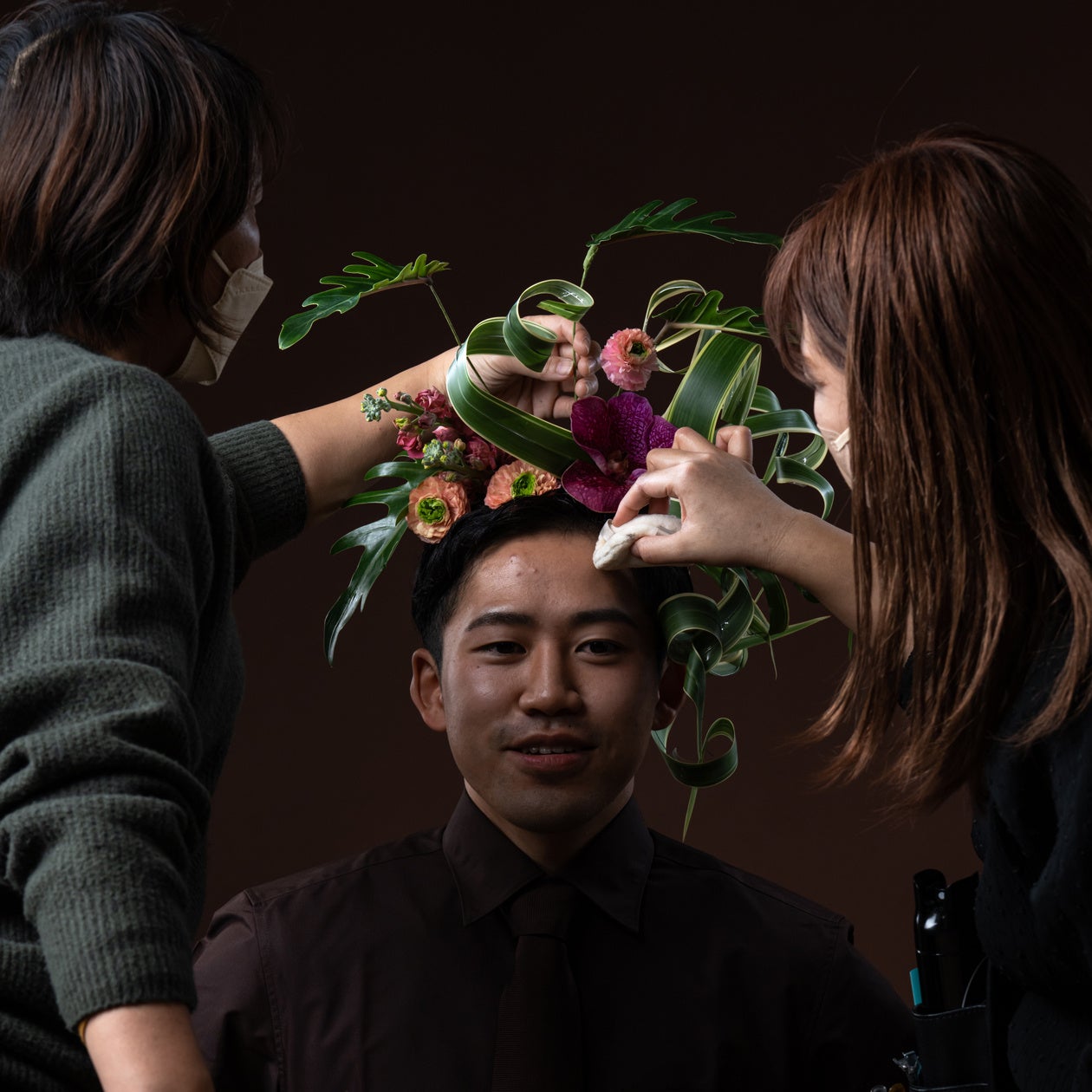 ワークショップにご参加の方は、収穫されたばかりの希少なヴィンテージブラウンやさまざまな花材を使ってオリジナルのヘアアレンジメントを制作、完成したら頭につけて「花」と「笑顔」が際立つフォトブースにて、家族や恋人、友人同士で撮影ができます。