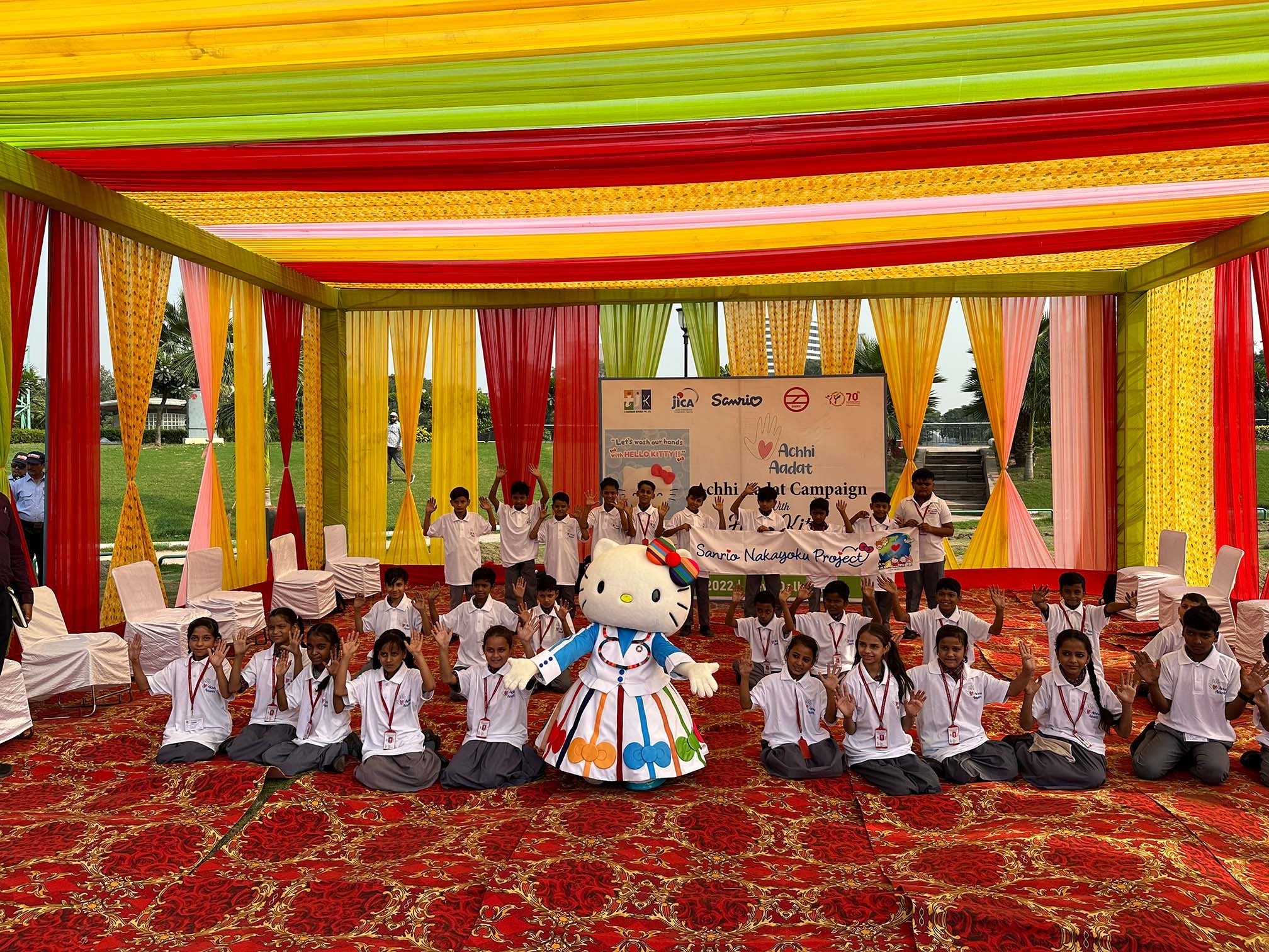 デリーで開催した、様々な衛生習慣を広めるための「アッチー・アーダットキャンペーン」のイベントにハローキティが参加しました。2022年11月9日(水)と10日(木)の2日間にわたりキャンペーン活動が行われました。