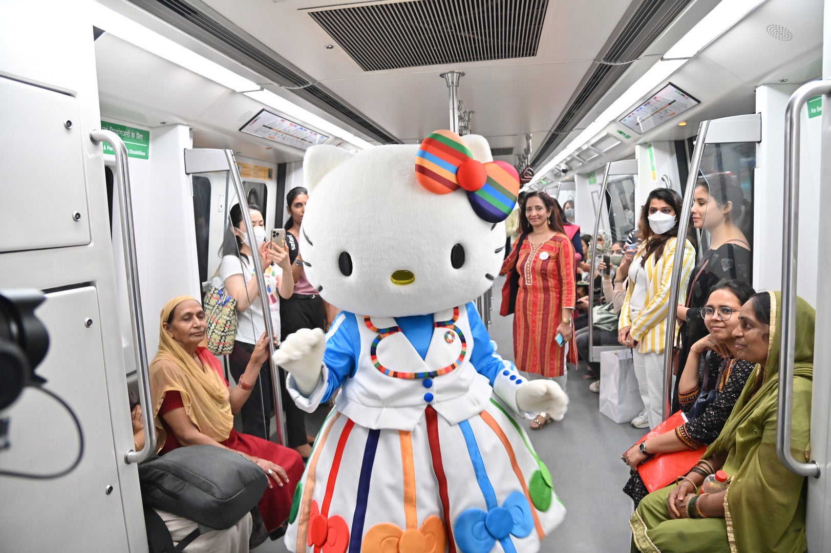ハローキティがデリーメトロのラジブ・チャウク駅からパテル・チャウク駅まで乗車し、女性専用車両に乗る体験をしました。パテル・チャウク駅では、スクール「Sarthak Prayas」の生徒15名が出迎え、ハローキティとともに手洗いの8ステップを学びました。