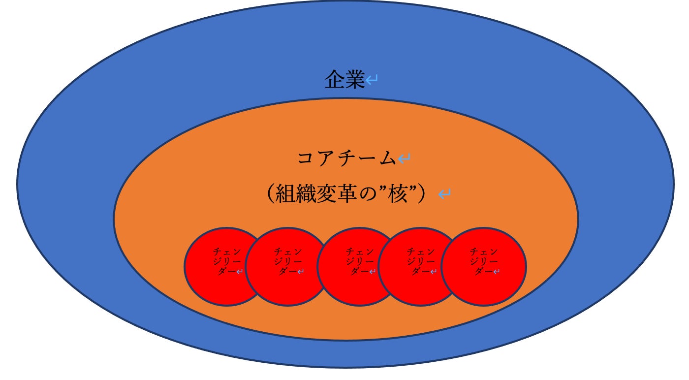 そして、組織を変革するための「コアチーム」を企業内部に育成します。コアチームは、チェンジリーダー数名で構成します。大企業であれば、まずは5名、100名以下の中小企業であれば、社長1人だけでも十分です。