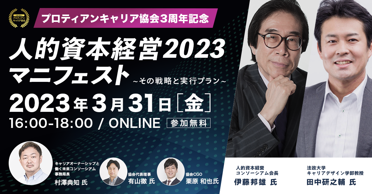 セミナーには、人材版伊藤レポートの座長を務め、人的資本経営コンソーシアム会長の伊藤邦雄氏(一橋大学CFO教育研究センター長)と村澤典知氏(キャリアオーナーシップとはたらく未来コンソーシアムの事務局長)をお招きし、2023年の人的資本経営マニフェストについて語り尽くします。是非ご参加ください。https://protean-humancapital.peatix.com