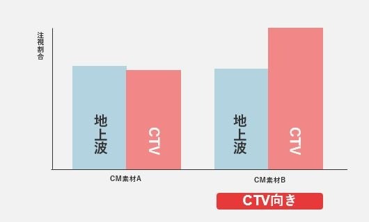 自社CMが注視されたかどうかをCTVと地上波で比較可能です。クリエイティブ素材AとBをCTVと地上波で出稿した場合、どちらがより注視されたのかを計測できます。