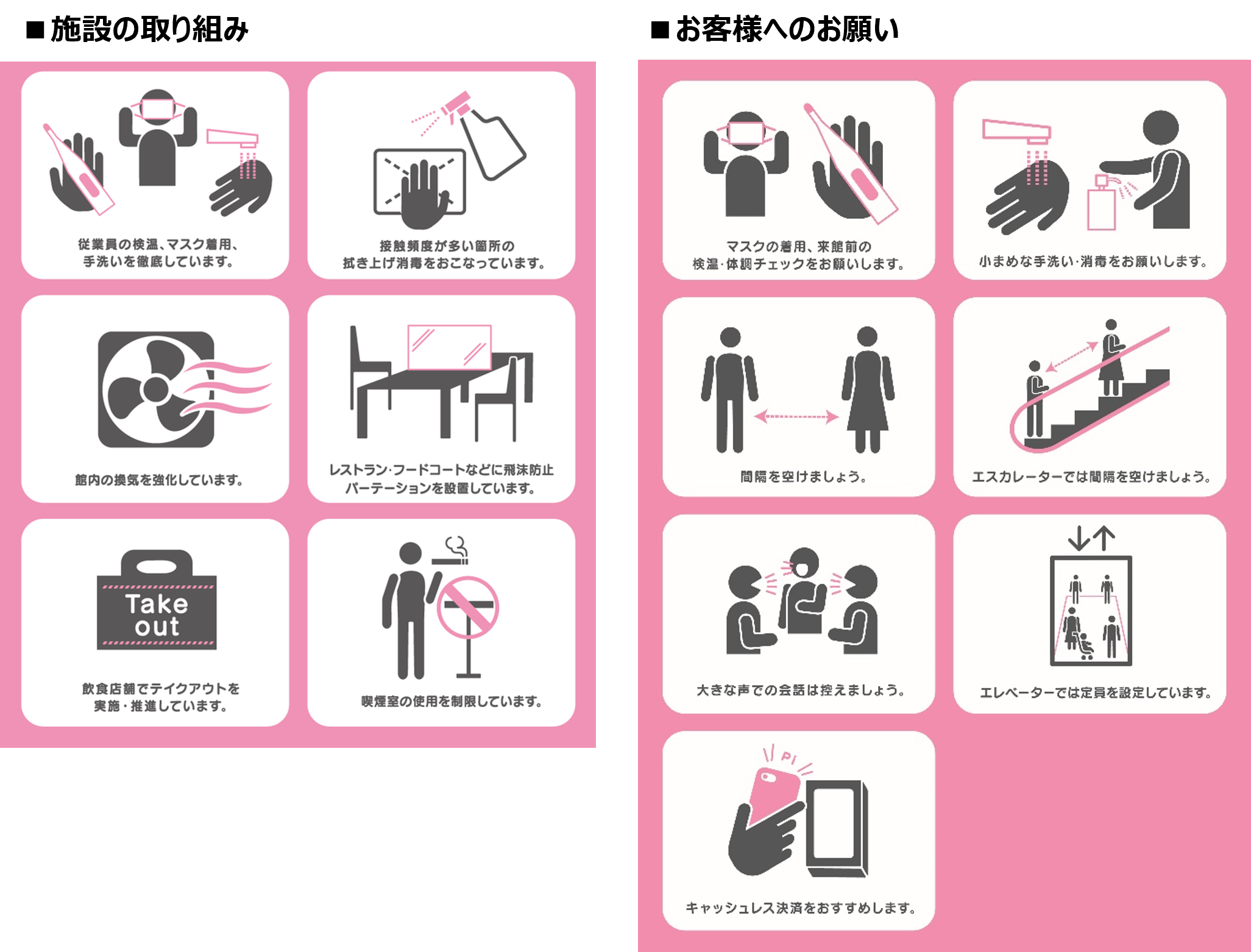 三井不動産グループが運営する商業施設では、新型コロナウイルス感染拡大防止のため、下記をはじめとした様々な取り組みを実施しております。