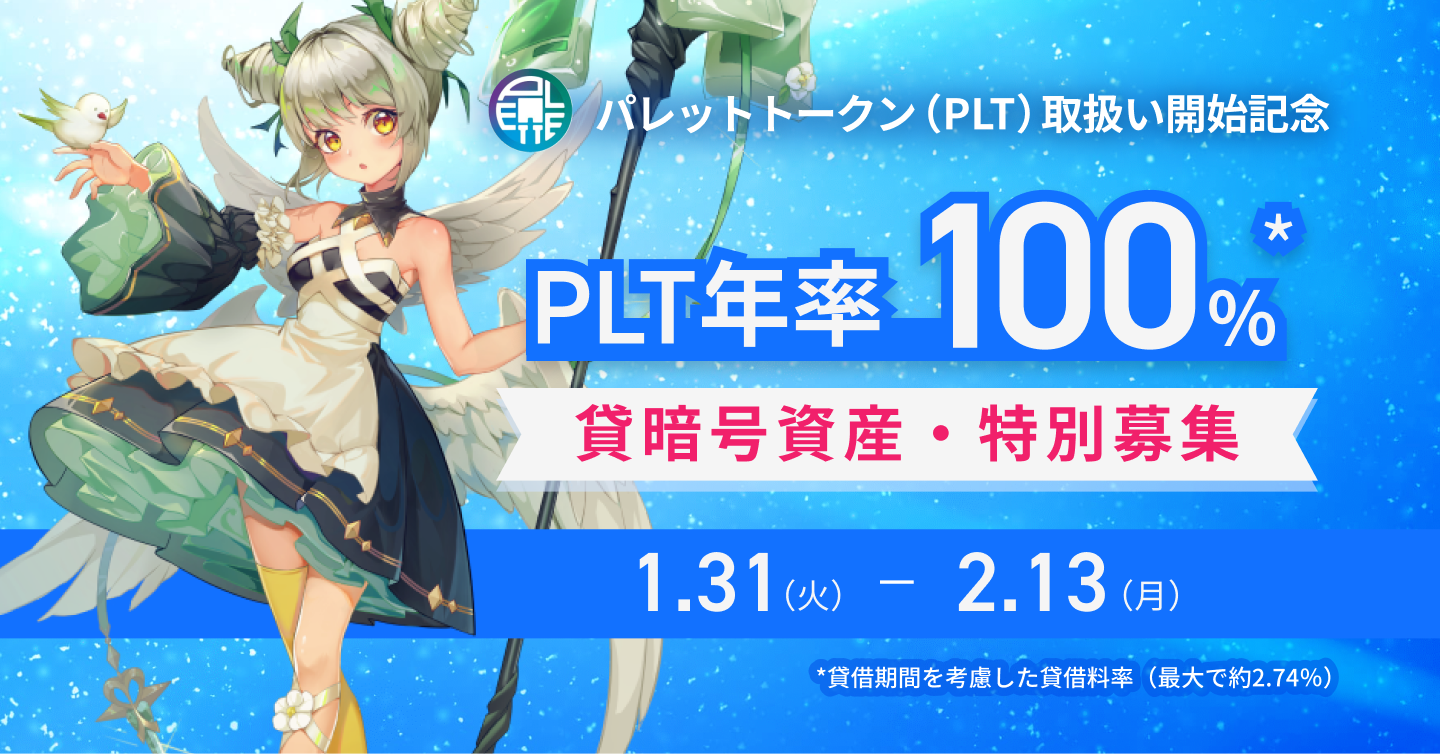 2023年1月31日(火)より、パレットトークン(PLT)の貸暗号資産(貸借期間:10日、年率100%*)の特別募集を開始いたします。 ぜひご参加ください!