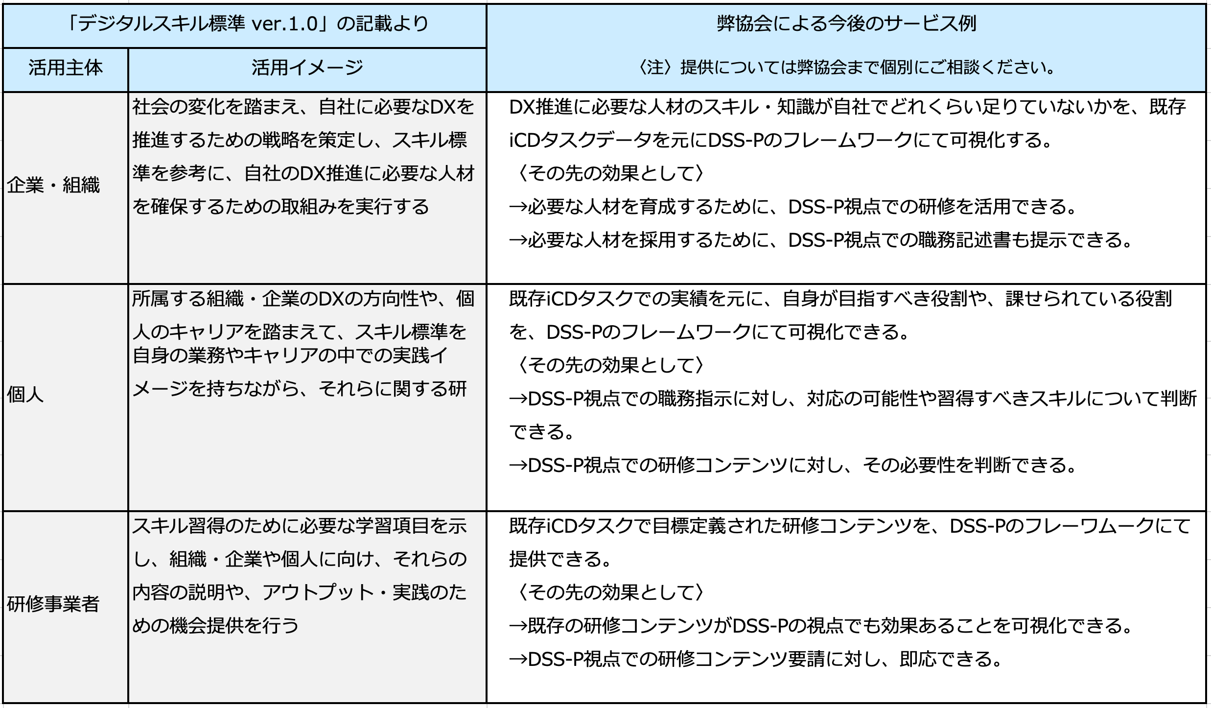 その活用イメージにおいて、DSS-PとiCDタスクの関連性を整理したことにより、弊協会では次のようなサービスが可能と判断しております。今後、順次対応して参りますので、ご期待ください。