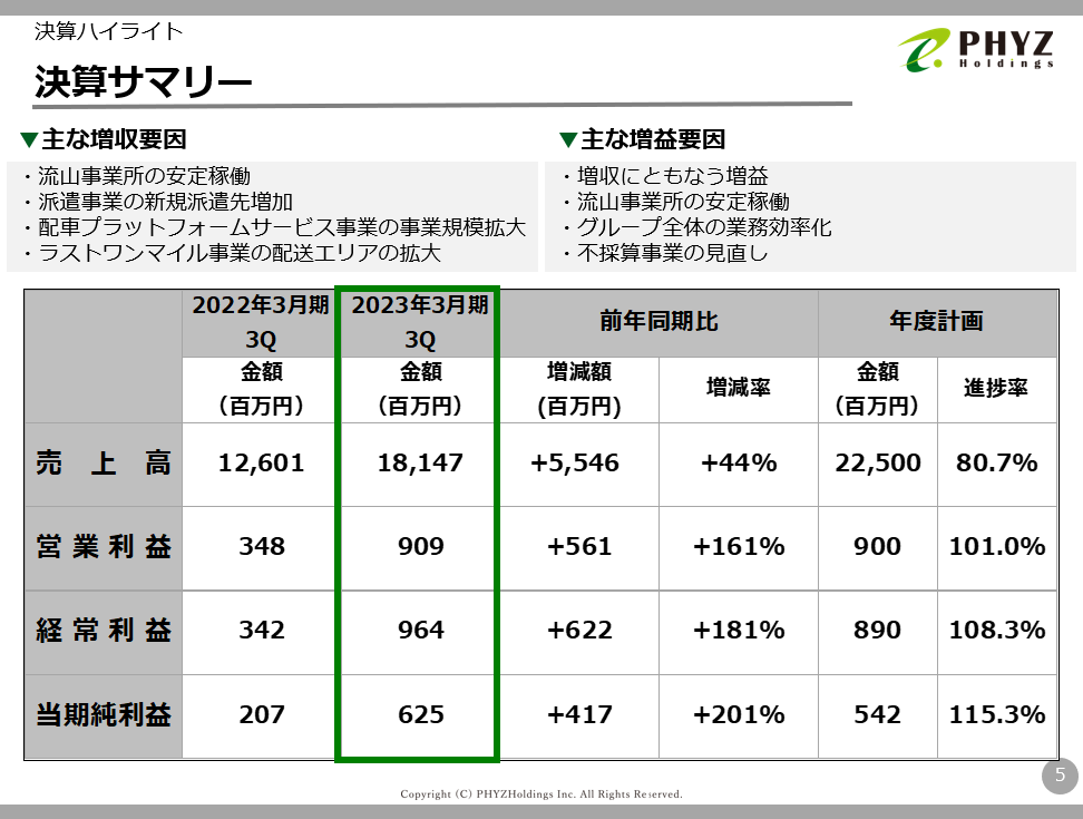主な増収要因は、前年度先行投資をした流山事業所の安定稼働、派遣事業の新規派遣先増加や配車プラットフォームサービス事業の事業規模拡大、ラストワンマイル事業の配送エリアの拡大となります。