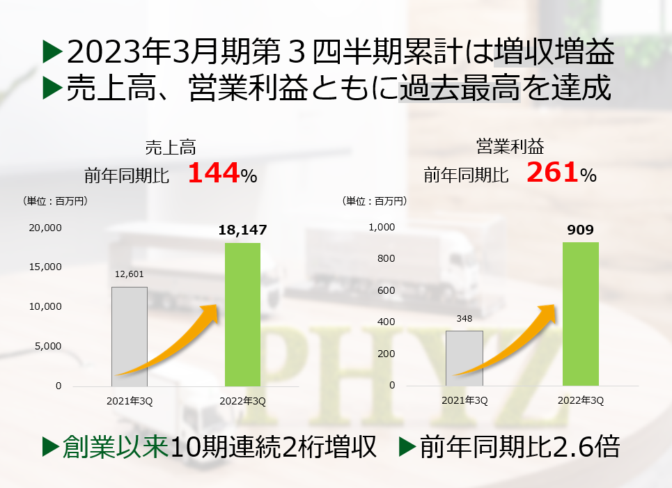 ファイズホールディングス株式会社(東証:9325 本社・大阪市北区、代表取締役社長:榎屋幸生)は、本日2023年1月31日に「第3四半期決算」「業績予想および配当予想の修正(増配)」を発表しました。