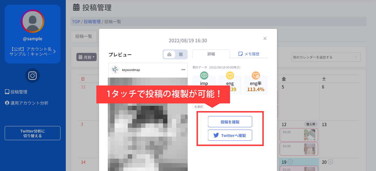 過去の投稿を1タッチで複製し再投稿することができます。またInstagramからTwitter、TwitterからInstagramへのプラットフォームを越えての投稿複製も可能です。有効な過去の投稿を利活用することで、工数を削減しつつ成果を最大化することに繋がります。