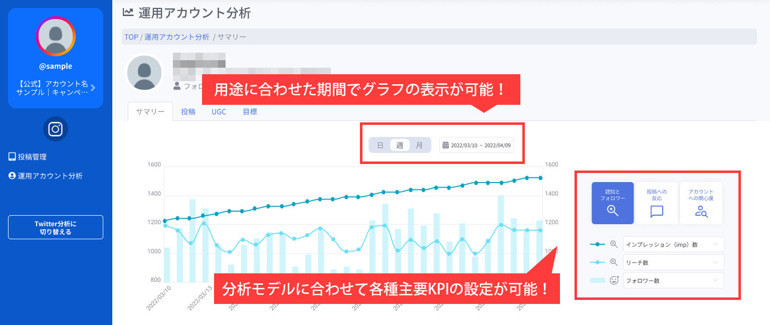 ワンクリックで、主要KPI(フォロワー数、リーチ数、インプレッション数、保存数、Webサイトクリック数など)の数値の増減・相関の確認を行うことができます。日・週・月単位で自由にグラフを表示でき、活用ケースごとに期間を変えて分析することが可能です。