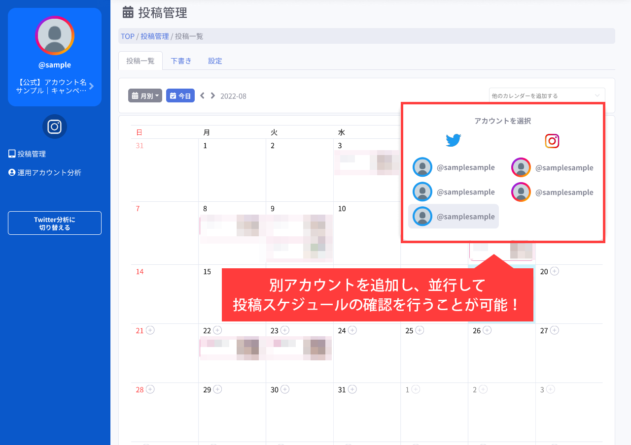複数アカウントを同時管理(Twitterアカウント・Instagramアカウントの組み合わせも可能)することが可能です。プラットフォームやアカウントを横断して投稿スケジュールの確認・策定を行うことが可能であり、より効率的にTwitter・Instagramアカウントの運用を行うことが出来ます。