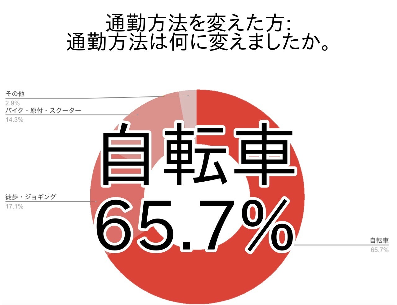 最も多かったのは「自転車(65.7%)」でした。密を避け、徒歩では行きづらい比較的遠方の勤務先にも行くことができ、テレワークによる運動不足を解消できる交通手段として人気です。