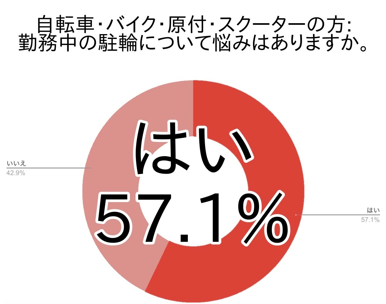 勤務中の駐輪に悩みがあると答えた方は6割弱(57.1%)でした。半数を大きく超える割合の方が駐輪に悩みを抱えていることが分かりました。