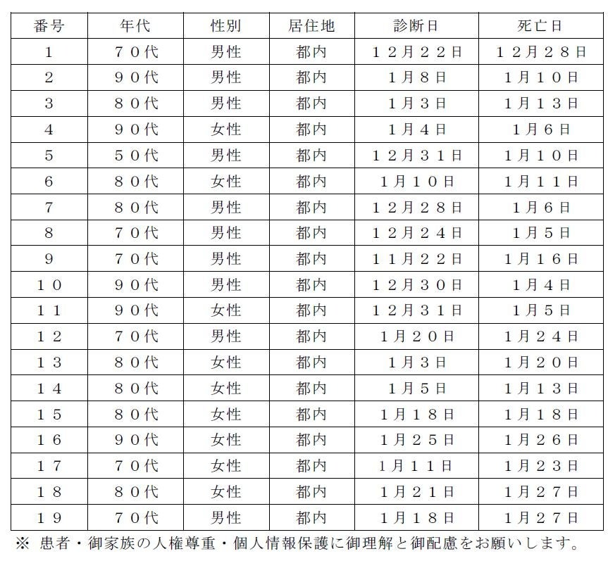 新型コロナウイルスに関連した患者の死亡について business Twitter Facebook はてブ Pocket LINE コピー 2023.01.31 この記事は約1分で読めます。 都内で新型コロナウイルスに感染した方が死亡されましたのでお知らせします。 お亡くなりになった方のご冥福をお祈り申し上げます。 1 新型コロナウイルスに関連した死亡者(本日公表分) 2 新型コロナウイルスに関連した死亡者の累計 7,645人