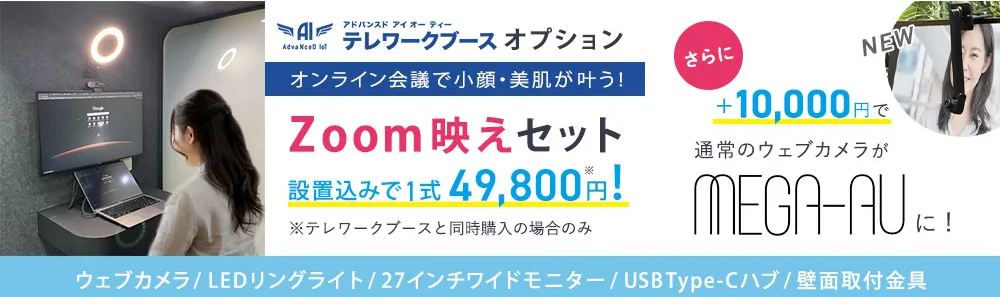 「AdvaNceD IoTテレワークブース」には、Web会議の印象アップのための「Zoom映えセット」というオプションセットもございます。27インチワイドモニターやLEDリングライトによって、顔色を明るく、表情や輪郭をきれいに映すので会議の相手に好印象を与えられます。
