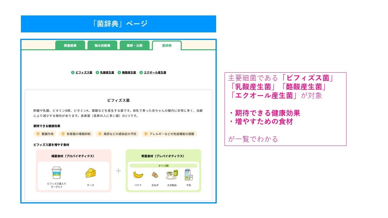 新しく「菌辞典」ページを追加しました。マイキンソー Gut V2の「主要細菌の割合」に該当する「ビフィズス菌」「乳酸産生菌」「酪酸産生菌」「エクオール産生菌」を対象に、菌の特徴や期待できる健康効果、菌を育てるのに必要な食事などの情報が一目でわかるように一覧にしました。