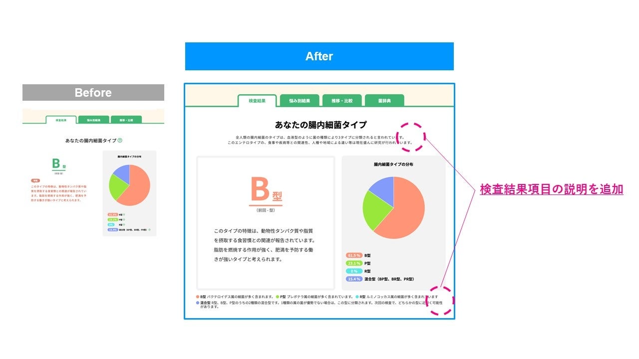 検査結果画面をより見やすくなるように、デザイン・レイアウトの変更を実施しました。各検査項目の説明文の表示箇所を見直し、手間なく様々な情報を読み取ることができるようになりました。さらに、スマートフォンで検査結果が読みやすくなるように改善しました。