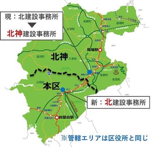 北区に二つ目の建設事務所を設置することにより、現在の北建設事務所を「北神建設事務所」に、新設する