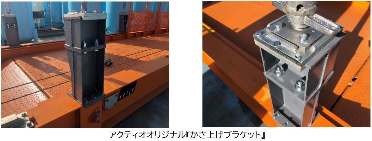 今回、そのような問題を解決するため、新たにアクティオオリジナル『かさ上げブラケット』を開発し、従来の「スカイプラットフォーム」のサポート(支柱)では、届かなかった天井高にも対応できる商品として完成させました。アクティオオリジナル『かさ上げブラケット』を使用することで、安全、迅速に資機材の搬入が可能となり、工期の短縮を実現していきます。