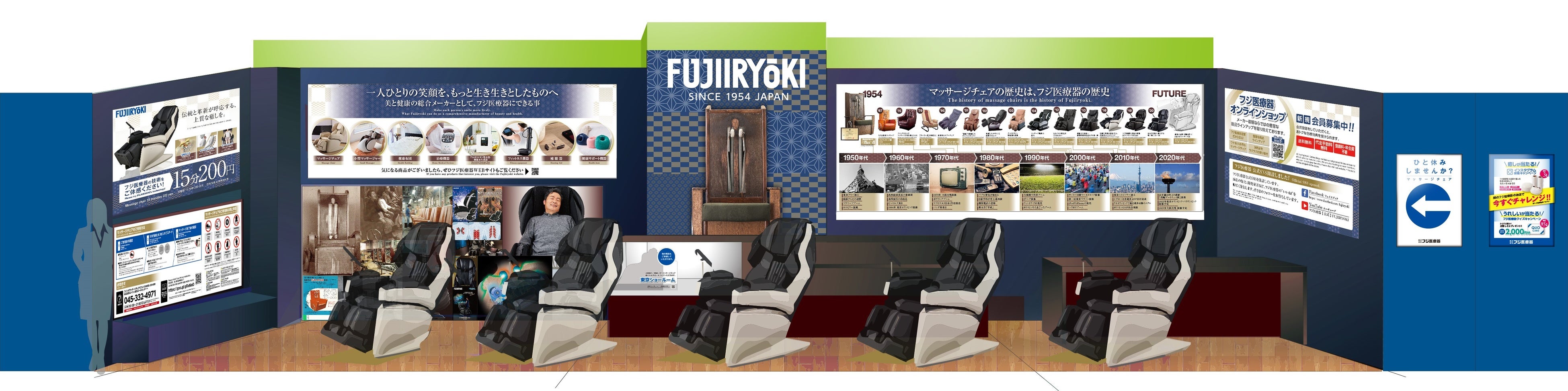 マッサージチェアなどの製造・販売・輸出入を行うフジ医療器が“マッサージチェアの進化”を 見学、体験できるくつろぎ空間を提案します。マッサージチェアを体感できるスペースには、外国人のお客さまも安心して試していただけるよう、多言語(日本語・英語・中国語・韓国語)の使い方ガイドをご用意。マッサージチェアの歴史と技術の変遷は日本語と英語のパネルで解説しています。
